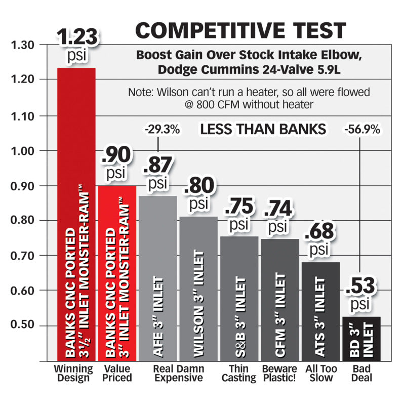 Monster-Ram raises boost without increasing backpressure at the turbine by Improving airflow from the intercooler. Result: a more responsive, fuel-efficient engine. Has six 1/8-inch NPT ports! The Banks Monster Ram is the highest performing Cummins Intake Elbow on the market, outflowing all competitors including our previous designs! Why It's Better. No Other Elbow Beats Banks. At Banks Power, just enough is never enough when it comes to engine airflow. Maximum power, performance, and efficiency are the ultimate goals, but to make it all happen, the engine has to breathe freely without needless restrictions. Finding ways to pump your engine full of cooler, denser air has always been the key. Our High-Ram intakes have always whipped the competition, and now our new 3.5 inch Monster-Ram flat-out destroys even our own previous designs!Key Features: Delivers instant torque. Quicker throttle response. Improves airflow from the intercooler. Larger and less restrictive than stock intake. Raises boost without increasing turbine drive pressure. Uses OEM Boost Tube. Up to six 1/8-inch NPT ports. Out-boosts the competition by up to 56.9%. CNC port-matched for stock heater and Banks Billet Heater Delete. Optional 3.5-inch mandrel-bent boost tube