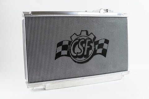 CSF has over 5 decades of experience manufacturing radiators. So when it comes to keeping your engine cool and your MK4 Supra running at its best, a CSF High-Performance All-Aluminum Radiator is the obvious choice. Designed to perform on the street or at the track, a performance radiator is a must-have for both high horsepower builds as well as race vehicles which need added cooling performance in motorsports environments. This radiator features a 2-Row core with CSF's exclusive B-Tube Technology: Unlike a regular oval shape "O" type radiator tube, CSF uses a specially engineered tube in the shape of a "B". These "B-tubes" are carefully formed and then brazed over the seam to seal. CSF is able to use thinner and lighter aluminum material (with better cooling efficiency) because this design is actually stronger than normal "O" shape tubes that are welded. The design (inlet in the middle of the tube that is seam brazed) increases the heat transfer surface area of the tubes by approximately 15% over regular tubes - producing the efficiency of two smaller tubes vs. one large tube within the same space criteria. With "B-tubes" you are able to get "dual liquid laminar flow". CSF also uses ultra efficient multi louvered fins that are carefully and precisely aligned to maximize airflow through each radiator core. Fin specifications are carefully measured and calculated for each application, and tested for maximum heat rejection efficiency in our wind-tunnel lab.