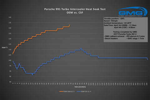 CSF's Porsche 991 Turbo intercoolers have been race-tested, logged, and fully validated by some of the world's best Porsche tuners. These intercoolers have been regarded as the "Go-To" option for the best performance and value available in the performance aftermarket. From first glance the increase in width from the OEM's 80mm core to the CSF's 115mm width is very apparent. Critical for vehicles running performance tunes with bolt-on modifications. Considered a mandatory upgrade for vehicles running upgraded turbo systems. The larger capacity CSF bar/plate core design can handle significantly more airflow + increased boost pressures compared to the OEM intercooler system. CSF's 100% TIG welded cast end tanks, paired with its high-efficiency bar/plate intercooler core. Compared to the OEM style tub/fin core, which is crimped onto the plastic end tanks. The weaker OEM design can crack under high boost or vibrations typical to race conditions. The design of CSF's end tanks allows for airflow to be distributed evenly throughout the entire intercooler compared to the OEM intercooler design which is much shallower. The OEM design makes it more difficult for airflow to reach the top/bottom tube sections at the ends of the intercooler. CSF's Porsche 991 Turbo intercoolers are finished with an aero-space grade, Nano-particle, heat dispersion coating that dissipates heat around 35% better than uncoated raw aluminum. The coating is applied in California, USA by an aerospace coating company who also supplies coatings for Boeing. This unique coating is a key feature to achieving world-record performance, exclusively available from CSF.